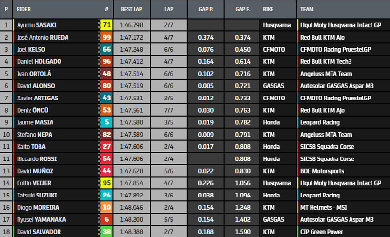 En effet, six pilotes au total ont battu la référence datant de 2021. Parmi eux, la sensation José Antonio Rueda (Red Bull KTM Ajo), deuxième à moins de 0.1s, vainqueur du JuniorGP World Championship ainsi que de la Red Bull MotoGP Rookies Cup en 2022, un exploit inédit. David Muñoz (KTM Boé Motorsports) est également proche à seulement 0.101s. Diogo Moreira (KTM MT Helmets MSi), très en vue depuis le début du weekend, pointe troisième à 0.165s, suivi de Daniel Holgado (Red Bull KTM Tech3) à 0.198s de la tête et toujours sous l’ancien record. Enfin, le dernier en forme est Kaito Toba (Honda Sic58 Squadra Corse) en 1’47.216, accessoirement le premier pilote Honda.
