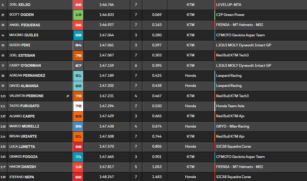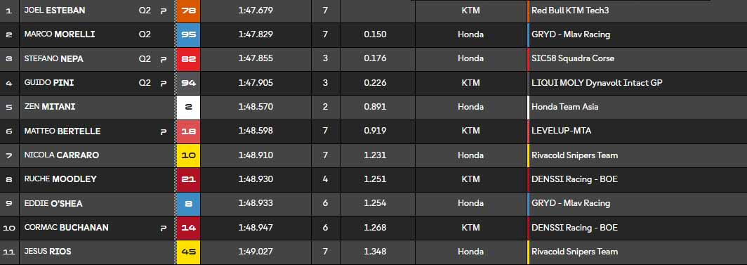 Le jeune Marco Morelli (Honda GRYD Mlav Racing) est le premier à inscrire un temps significatif dans cette séance. Mais ce n’est que le début. Finalement, après 15 minutes de bataille pour aller chercher le meilleur temps, le remplaçant de Jacob Roulstone Joel Esteban (Red Bull KTM Tech3) conclut la session en tête. Marco Morelli est deuxième sans démériter, devant Stefano Nepa (Honda Sic58 Squadra Corse) et Guido Pini, dernier qualifié pour la Q2. Une séance calme, sans anicroche.