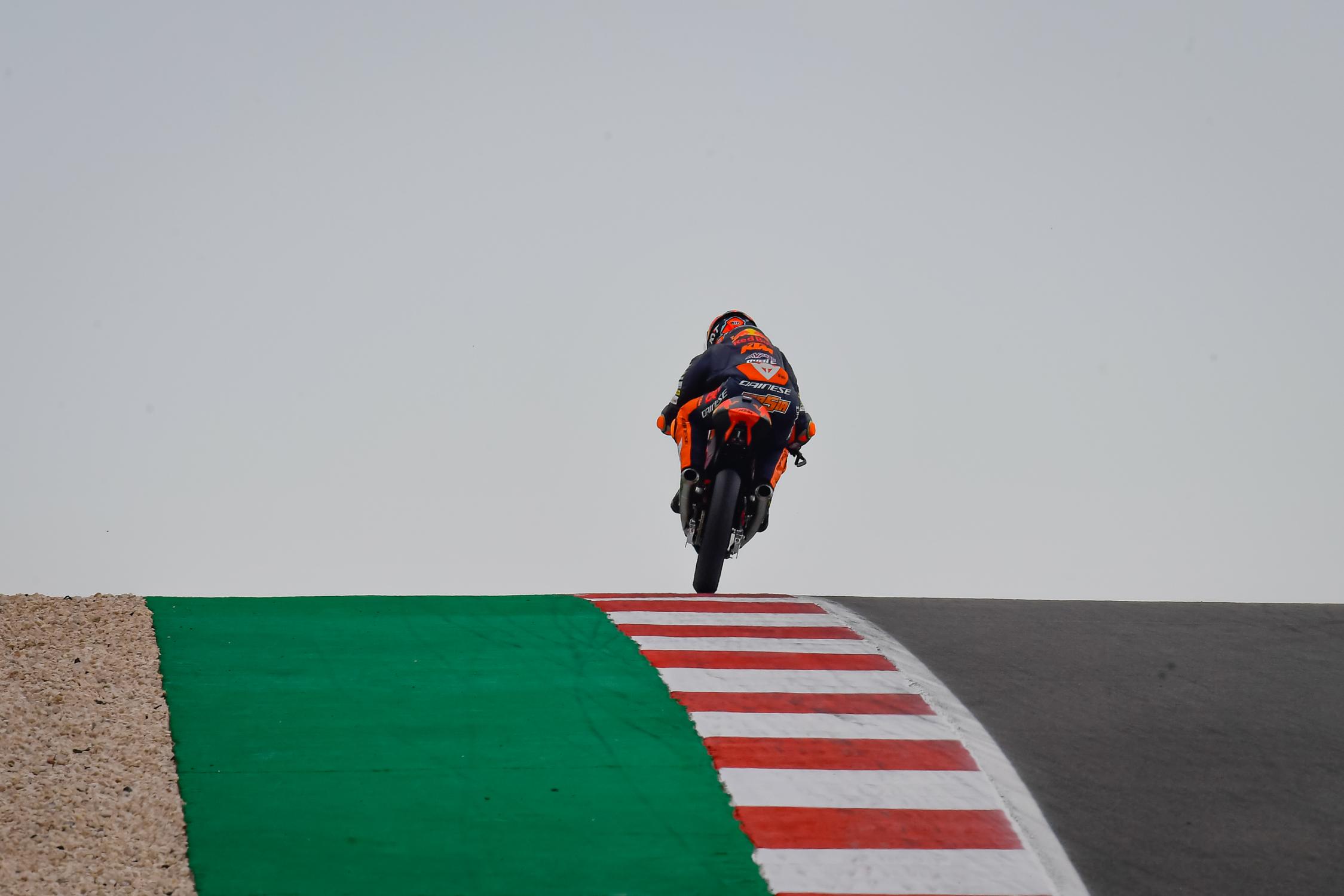 Romano Fenati (Husqvarna, Sterilgarda Max Racing Team, #55) et Stefano Nepa (KTM, BOE Owlride, #82) s’élancent 1 min après, et 2 min après, c’est quasiment l’intégralité des Moto3 qui rejoignent le tracé de Portimão, qui est légèrement poussiéreux ce matin.