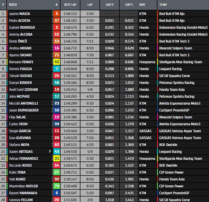 A la mi-séance, c’est Jaume Masiá (KTM, Red Bull KTM Ajo, #5) qui est crédité du meilleur chrono, avec un 1’48.617, devant Pedro Acosta (KTM, Red Bull KTM Ajo, #37) et Gabriel Rodrigo (Honda, Team Gresini Moto3, #2).