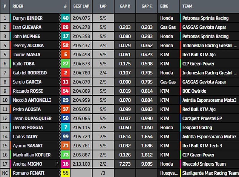 Darryn Binder (KTM, Petronas Sprinta Racing, #40) semble très en forme, après son chrono sensationnel réalisé en Q1. Il réalisé un 2’04.354 dès son premier tour lancé, ce qui le place en pole avec le record du circuit en prime. Il devance Jeremy Alcoba (Honda, Team Gresini Moto3, #52) de 83 petits millièmes de seconde. Gabriel Rodrigo (Honda, Team Gresini Moto3, #2) complète la première ligne provisoire, à 5min de la fin de séance.