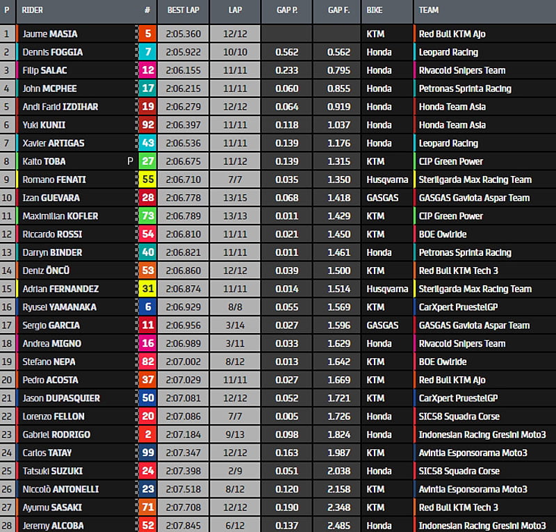 McPhee claque un 2’06.215 mais Masia fait largement mieux en 2’05.360. Foggia suit, Salac ferme le trio de tête à McPhee. Izdihar est dans le top 5. Kunii, Artigas, Toba, Fenati et Guevara constituent le top 10. Lorenzo Fellon est 22e. Acosta est 20e. Darryn Binder est 13e.