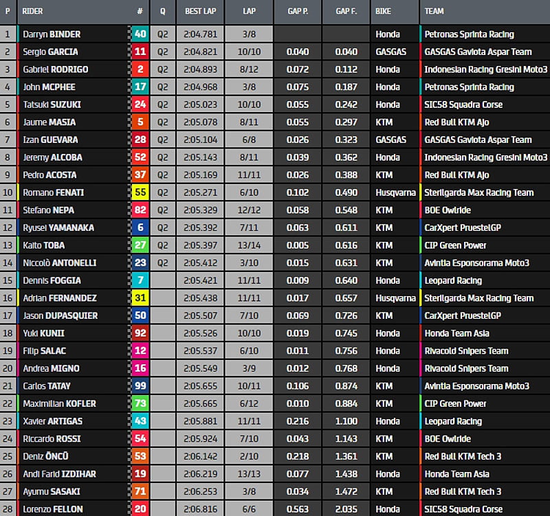 Kaito Toba (CIP – Green Power), Romano Fenati (Sterilgarda Max Racing) et Izan Guevara (GASGAS Gaviota Aspar Team) complétaient le Top 10 provisoire. Le Français Lorenzo Fellon (SIC58 Squadra Corse) occupe à ce stade la 22e position.
