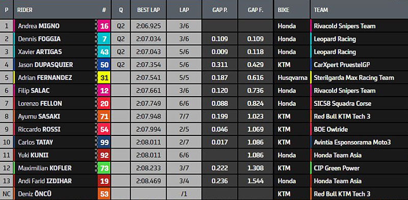 Lors du dernier tour, 5 pilotes roulent en paquet afin de profiter de l’aspiration, ce sont les 5 premiers au classement. Rien n’est encore joué, car il n’y a que 4 places pour la Q2 ! Au final, ce sont Andrea Migno (Honda, Rivacold Snipers Team, #16), Dennis Foggia (Honda, Leopard Racing, #7), Xavier Artigas (Honda, Leopard Racing, #43) et Jason Dupasquier (KTM, CarXpert PruestlGP, #50) qui s’en sortent le mieux et passent en Q2.