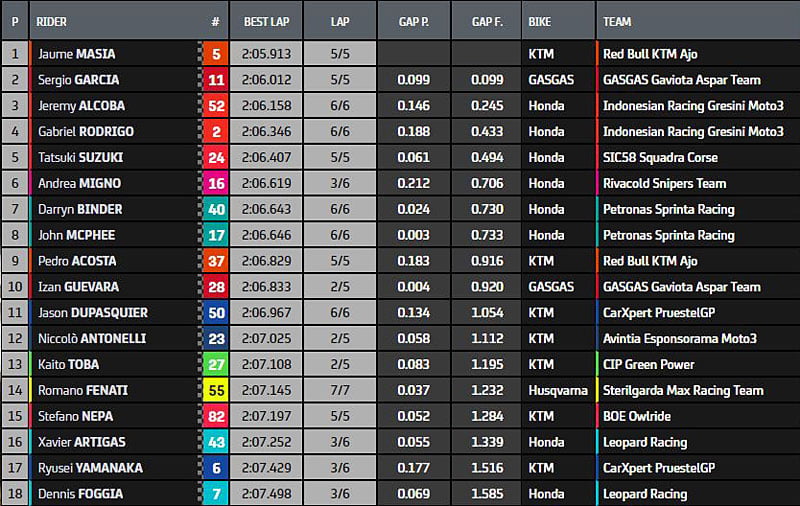 Andrea Migno (Honda, Rivacold Snipers Team, #16) prend la neuvième position, tandis que Pedro Acosta (KTM, Red Bull KTM Ajo, #37) a complète le top dix devant son coéquipier Jaume Masia. Bien que les deux pilotes aient obtenu des places en Q2, le rookie est l’un des pilotes sanctionnés par un départ dans la voie des stands pour avoir roulé lentement et avoir causé des perturbations en FP2. Bien que plus loin au chrono lors de la FP3, Stefano Nepa (KTM, BOE Owlride, #82), Ryusei Yamanaka (KTM, CarXpert PruestlGP, #6), Tatsuki Suzuki (Honda, SIC58 Squadra Corse, #24), Gabriel Rodrigo (Honda, Team Gresini Moto3, #2), Kaito Toba (KTM, CIP-Green Power, #27), Jeremy Alcoba (Honda, Team Gresini Moto3, #52) et Romano Fenati (Husqvarna, Sterilgarda Max Racing Team, #55) étaient d’ores et déjà qualifiés en Q2.