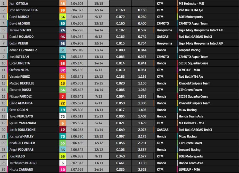 Attention à la chute pour David Almansa (Honda Rivacold Snipers Team), mais lui aussi se relève sans problème aucun. La décoration de sa Moto3 fait d’ailleurs référence à la machine pilotée par Andrea Dovizioso en 125cc. La séance est relativement calme, sans grande action car elle ne compte pas pour les qualifications de demain. Mais Rueda, bien qu’il soit deuxième à huit minutes du terme, a montré une vitesse démentielle lors des essais de pré-saison à Jerez. Il est à surveiller, lui qui était le premier, en 2021, à remporter le championnat JuniorGP ainsi que la MotoGP Red Bull Rookies Cup.