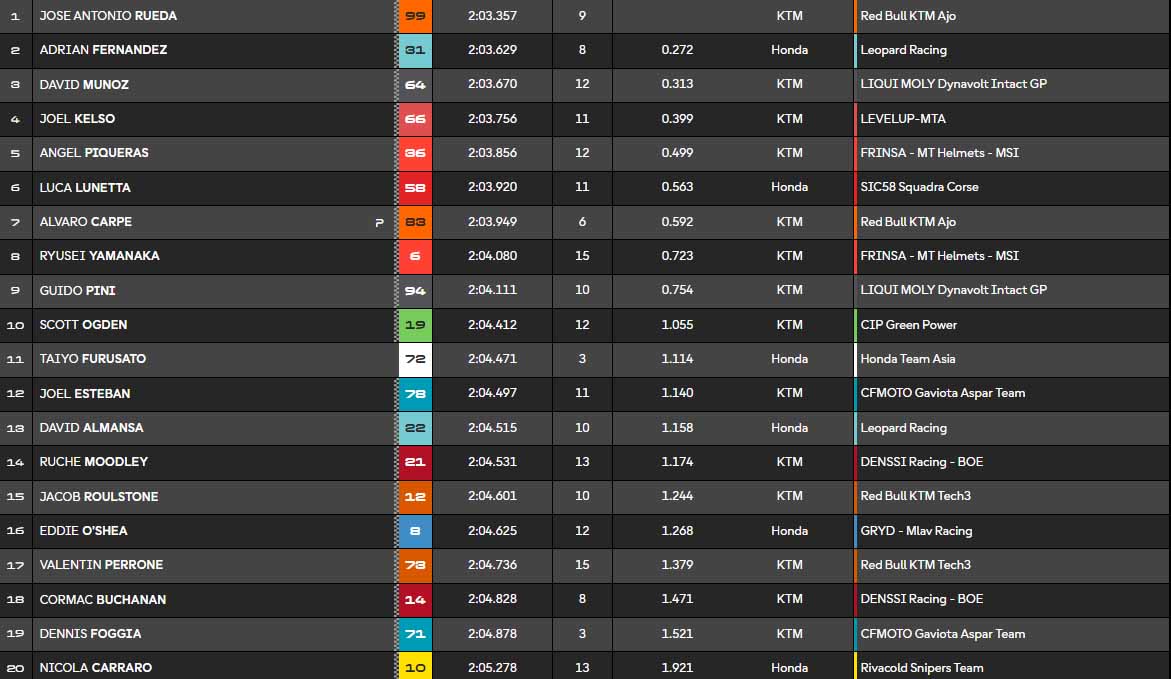 À la présentation du drapeau à damier, José Antonio Rueda conclut la séance en tête, devant Adrian Fernandez, David Munoz, Joel Kelso et Angel Piqueras (KTM MT Helmets MSi).
