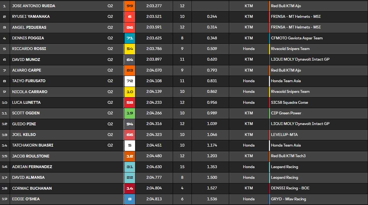 Finalement, au bout du compte, José Antonio Rueda conclut cette Practice en tête, juste devant Ryusei Yamanaka. Angel Piqueras est troisième, devant Dennis Foggia et Riccardo Rossi (Honda Snipers Team).