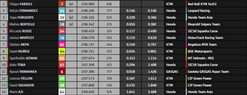 Pendant ce temps, le rookie Filippo Farioli (Red Bull KTM Tech3) passe en tête avec un temps canon. Ils vont définitivement se rapprocher du record de la piste en Q2, c’est une certitude. Et l’Italien n’est pas rattrapé ! Bravo à lui, il est le premier qualifié. Il est suivi par Taiyo Furusato, Adrian Fernandez (Honda Leopard Racing), et Matteo Bertelle. Le pilote Honda Sic58 Squadra Corse Riccardo Rossi est le premier des lésés. Plusieurs pilotes sont sous investigation pour avoir étés trop lent et à la recherche d’une roue.
