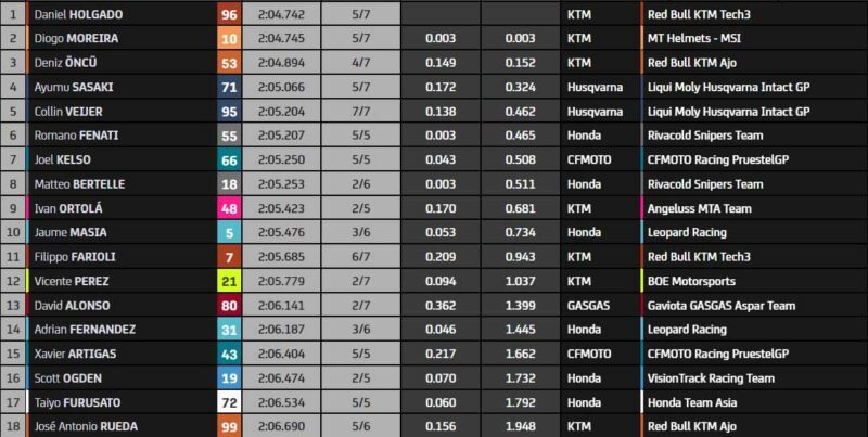 Mais attention à la chute de Scott Ogden (Honda VisionTrack Racing), qui provoque la sortie de drapeaux jaunes ! Cela va bouleverser toute la hiérarchie, et Jaume Masia est piégé ! Ceci profite à Daniel Holgado, qui prend ici sa première pole position cette saison ! Diogo Moreira est deuxième, alors que Deniz Oncu complète la première ligne.