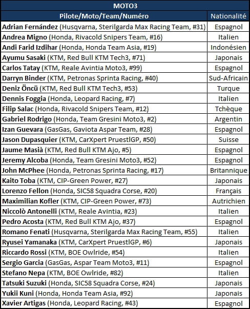 Il notera également les pilotes qui ont changé d’équipe : Jaume Masiá (KTM, Red Bull KTM Ajo, #5), Sergio Garcia (GasGas, Aspar Team Moto3, #11), Andrea Migno (Honda, Rivacold Snipers Team, #16), Niccolò Antonelli (KTM, Reale Avintia, #23) et Darryn Binder (KTM, Petronas Sprinta Racing, #40).