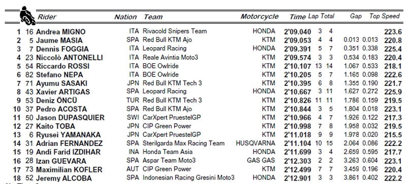 Lors de la séance inaugurale, seuls 18 pilotes ont pris la piste, le plus rapide d’entre eux, Andrea Migno (Honda, Rivacold Snipers Team, #16) établissant la première référence en 2’09.040 devant Jaume Masiá (KTM, Red Bull KTM Ajo, #5) et Dennis Foggia (Honda, Leopard Racing, #7). Les autres sont restés au box car la piste étaient très « sale » à cause du sable. En ce moment, les températures sont très élevées au Qatar, ce qui procure des conditions peu favorables pour les chronos…