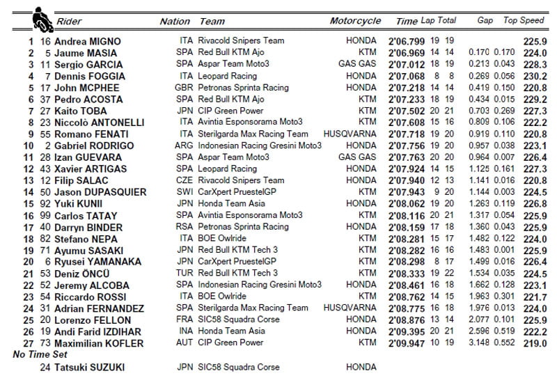 Au niveau des chronos, on reste sur un record établi en 2019 par Arón Canet (KTM, Sterilgarda Max Racing Team ) en 2’04.561 alors que Filip Salač (Honda, Rivacold Snipers Team) s’était montré le plus rapide des tests hivernaux en 2’04.892.