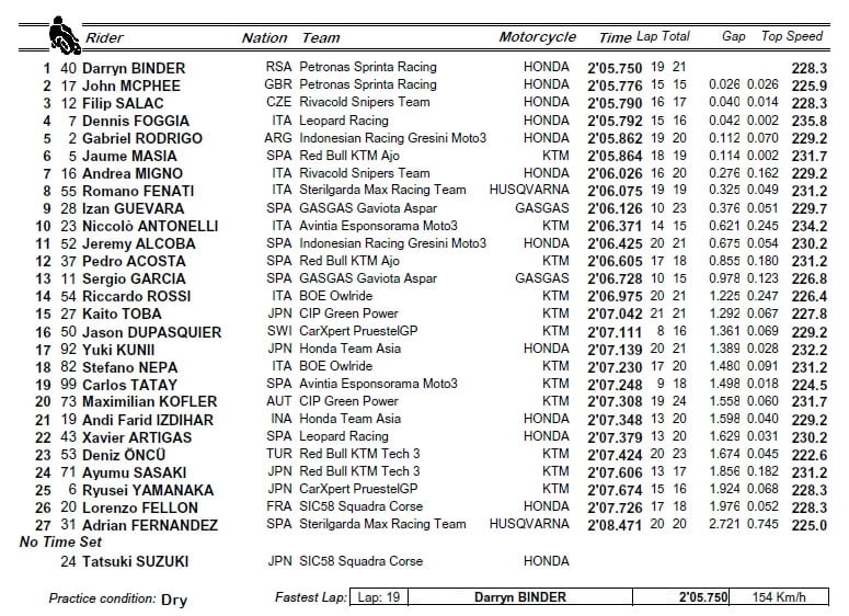 De façon logique, la troisième séance de cette première journée s’est avérée la plus rapide, Darryn Binder (KTM, Petronas Sprinta Racing, #40) se portant en tête avec ses nouvelles couleurs du team Petronas: l’adaptation à la Honda n’aura pas pris beaucoup de temps…