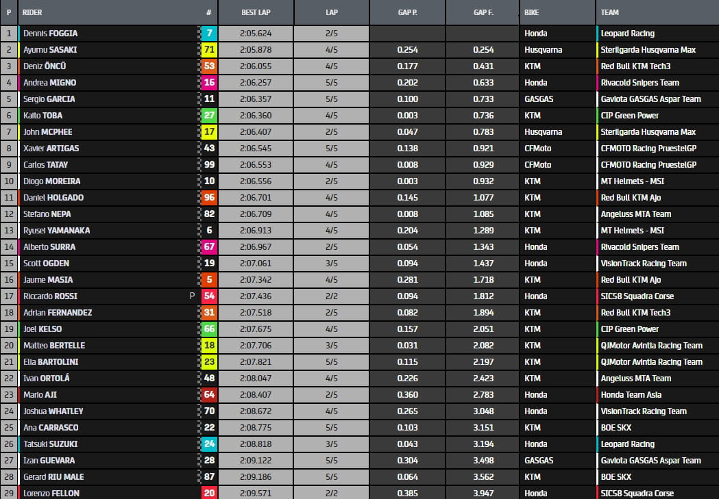 Cela n’impacte pas le moral de Dennis Foggia (Honda, Leopard Racing, #7), qui est le plus rapide en 2’05.624 dès son premier tour chronométré. Il est suivi d’Ayumu Sasaki (Husqvarna, Sterilgarda Husqvarna Max, #71) et de John McPhee (Husqvarna, Sterilgarda Husqvarna Max, #17).
