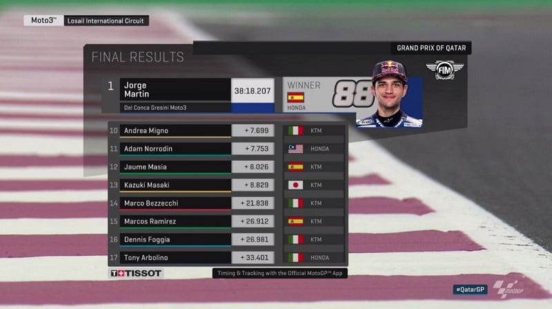 Jorge Martin l’emportait sur le fil avec 0.023 d’avance sur Aron Canet, tandis que Lorenzo Dalla Porta terminait troisième Niccolo Antonelli, Gabriel Rodrigo, Fabio di Giannantonio et Kaito Toba.