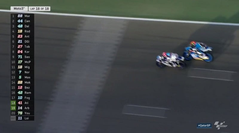 Soudain le leader Enea Bastianini chutait sans gravité dans le virage 6, laissant Martin et Canet seuls à la lutte pour la victoire, avec 1.2 d’avance sur le troisième Dalla Porta, qui roulait en compagnie de Kornfeil, Rodrigo, Antonelli et Bezzecchi. Sasaki huitième perdait du terrain, tout comme Fabio di Giannantonio et John McPhee.