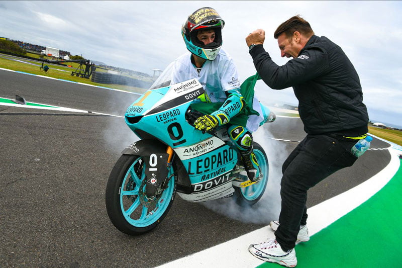 Deux autres podiums à Brno et Silverstone lui permettent de se battre pour la tête du classement avec son principal rival, Aron Canet (Sterilgarda Max Racing Team). Un autre podium à Buriram, renforcé par une deuxième victoire de la saison au Twin Ring Motegi, le place aux commandes du classement avant le Grand Prix à Phillip Island. Là, un drame survient dès le début du GP d’Australie lorsque Canet, son plus proche rival, chute dans les premiers tours, laissant Dalla Porta se diriger vers son objectif. Lors d’une épreuve de force classique en Moto3™ autour de l’un des circuits les plus difficiles du calendrier, le numéro 48 n’a rien lâché pour remporter sa troisième victoire de l’année et s’assurer ainsi la couronne mondiale.