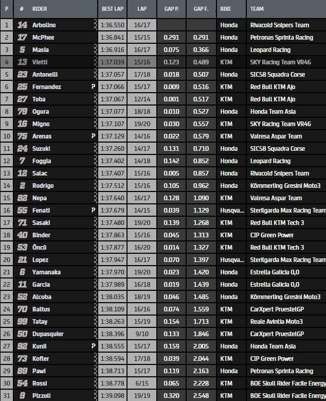 A frantic end to FP1 sees @TonyArbolino finish on top! 🔝@johnmcp17 edges out @jaume_masia for second, three tenths shy of Arbolino! 🏁 #AustrianGP 🇦🇹 pic.twitter.com/ENgIwFfZcf