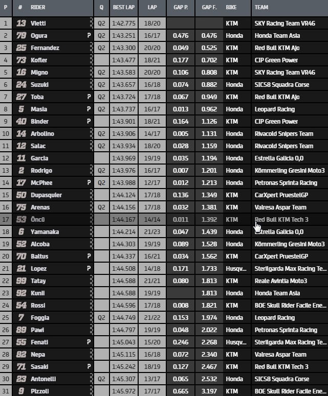 Fin de séance et c’est Vietti qui prend la tête des opérations devant Ogura et Fernandez.