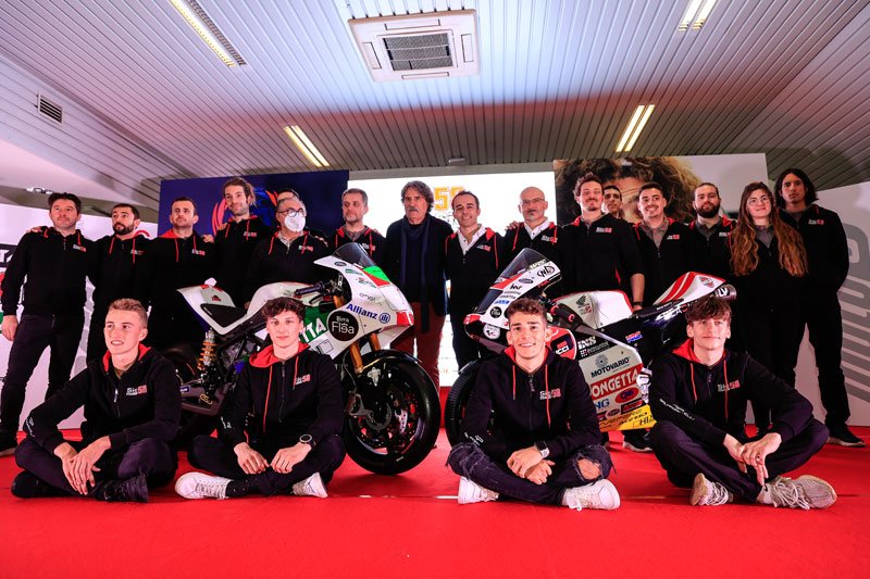 La présentation de l’équipe 2022 qui aligne Lorenzo Fellon et Riccardo Rossi en Moto3 n’échappe pas à la règle : ici, pas de déclaration des pilotes disant qu’ils sont heureux d’être dans l’équipe et qu’ils vont faire de leur mieux pour obtenir de bons résultats, mais un simple mot du patron insistant sur le côté familial et humain de la structure.