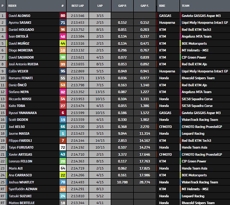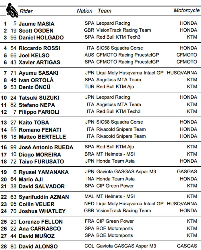 Toujours est-il que la grille de départ est composée de Jaume Masiá (Honda Leopard Racing),du héros local Scott Ogden (Honda Vision Track Racing) et du leader du championnat Daniel Holgado (KTM Red Bull Tech3) sur la première ligne, la deuxième étant constituée de Ricardo Rossi (SIC58 Squadra Corse), Joel Kelso (CFMoto Racing Prüstel GP) et son coéquipier Xavi Artigas (CFMoto Racing Prüstel GP).