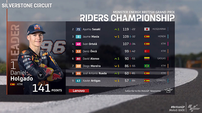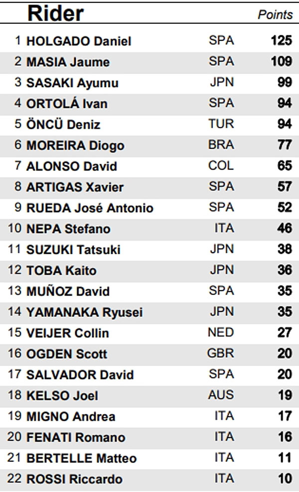Au championnat, Daniel Holgado a maintenant 22 points d’avance sur Ayumu Sasaki, Jaume Masiá ayant rétrogradé en 3e position.