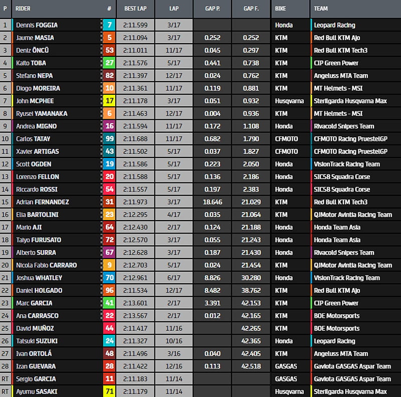 Dennis Foggia prend la tête des opérations à 12 tours de l’arrivée mais doit rapidement la concéder à son coéquipier Tatsuki Suzuki puis à Deniz Öncü suite à une petite erreur.