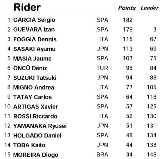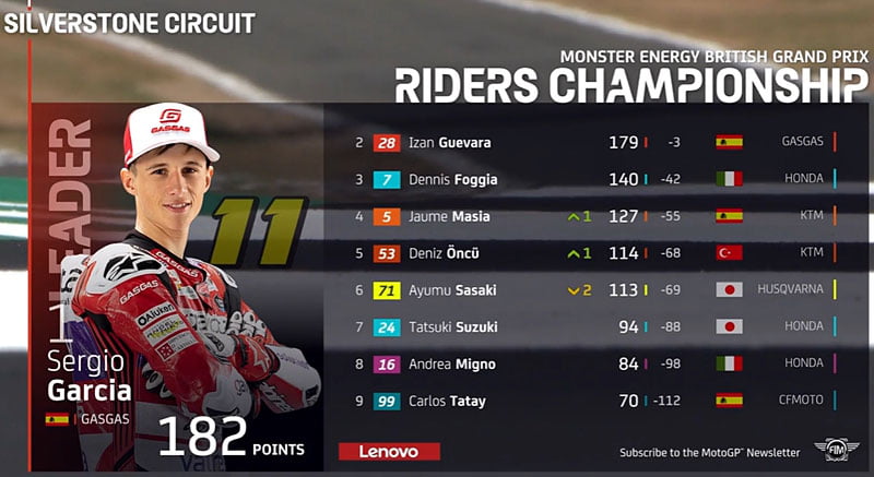 Avec l’abandon des deux leaders du championnat, ce dernier fait la bonne affaire au classement général., alors que Jaume Masiá a été l’auteur d’une remontée impressionnante et que Deniz Öncü obtient en Grande-Bretagne son premier podium de la saison.