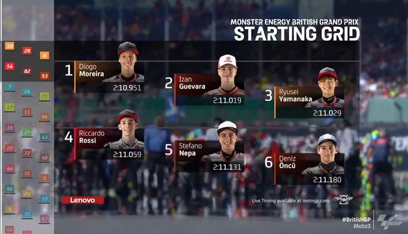 Diogo Moreira (KTM, MT Helmets – MSI) s’est en effet imposé en pole position pour la première fois de sa carrière en Grand Prix. C’est le premier Brésilien à se qualifier en pole position en 125cc/Moto3. Il tentera de monter pour la première fois sur le podium en Moto3 mais seuls trois pilotes se sont imposés depuis la pole à Silverstone en Moto3 depuis 2012 : Maverick Viñales (2012) sur une FTR-Honda, Álex Rins (2014) sur une Honda et Romano Fenati (2021) sur une Husqvarna.