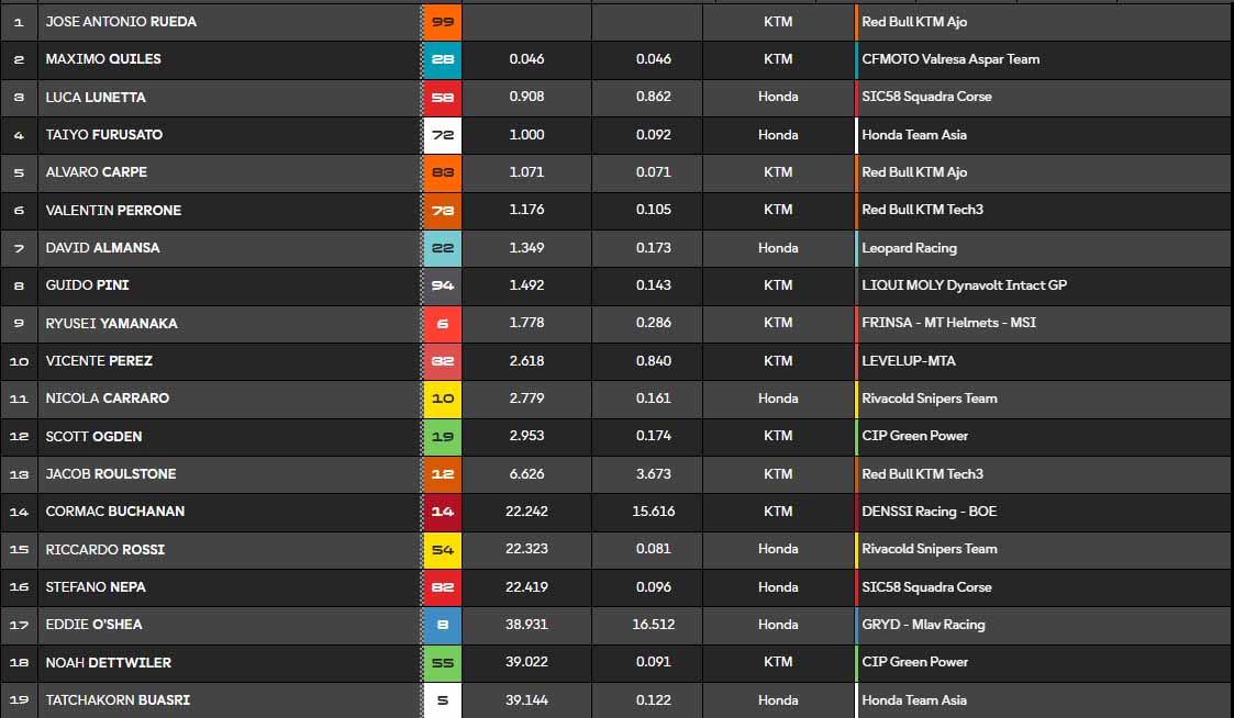 Finalement, au bout du suspense, José Antonio Rueda s’impose et imite Brad Binder ! Quelle course de l’Espagnol, c’est complètement dingue. Maximo Quiles, qui n’a pas démérité et qui a tenté jusqu’au bout, termine deuxième dans les échappements du pilote Ajo. Luca Lunetta est troisième, alors qu’Angel Piqueras a chuté dans les derniers instants. C’est le carton plein pour Rueda à Silverstone.