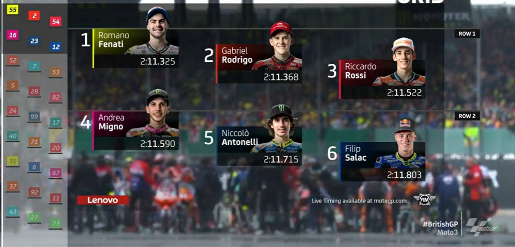 Gabriel Rodrigo (Honda, Team Gresini Moto3, #2), repêché en Q1, a occupé la première place de la Q2 pendant une grande partie de la séance, mais a dû s’incliner pour quatre centièmes de seconde. Riccardo Rossi (KTM, BOE Owlride, #54) a également impressionné en empochant la troisième place et un départ en première ligne à Silverstone.
