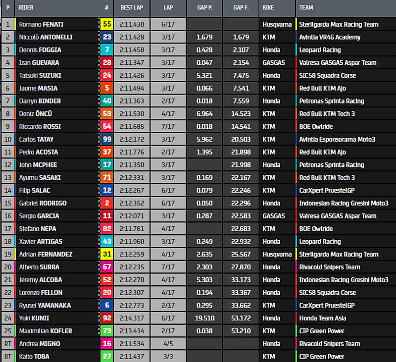 Dans le dernier tour, Izan Guevara prend le meilleur sur Dennis Foggia pour la troisième place du podium, mais ce dernier reprend l’avantage et les deux hommes fondent sur Niccolò Antonelli qui a lâché l’affaire pour la victoire.