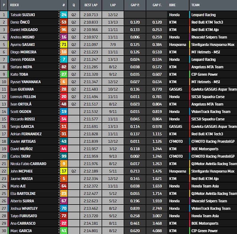 Tatsuki Suzuki sur Honda Leopard est quatrième, devant Lorenzo Fellon (SIC58 Squadra Corse) et Andrea Migno (Snipers). Le rookie David Munoz (KTM BOE) est septième, devant Dennis Foggia (Honda Leopard), Jaume Masia (KTM Red Bull Ajo) et Ayumu Sasaki (Husqvarna Max Racing Team), qui clôture le Top Ten.