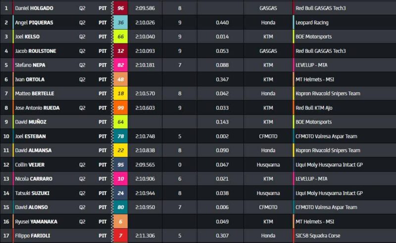 C’est Ivan Ortola qui s’en sort le mieux, juste devant Daniel Holgado et David Munoz (KTM Boé Motorsports). David Alonso a relâché ses efforts, et il n’est que 17e mais il sera en Q2 grâce à son temps d’hier. Enfin, c’est ce qu’on pensait ! Ortola est déclassé pour infraction sous drapeau jaune, ce qui fait passer Daniel Holgado en tête. Le top 3 change totalement avec les annulations de tour, Angel Piqueras (Honda Leopard Racing) et Joel Kelso sont maintenant deuxièmes et troisièmes.