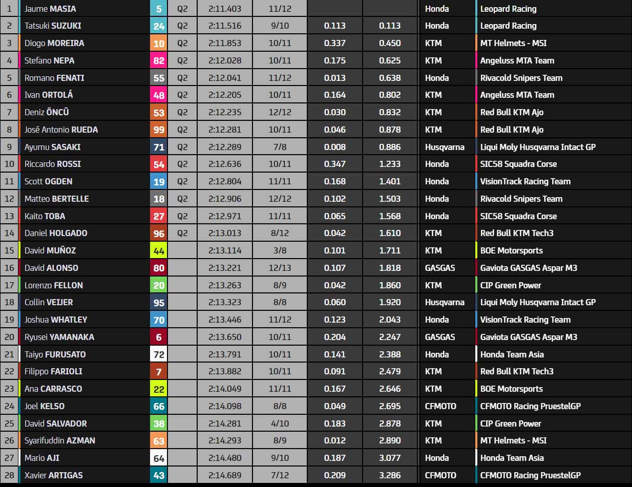 La situation s’emballe à trois minutes du terme. Tous les pilotes améliorent, mais Jaume Masiá plus que les autres : il conserve ainsi la tête. Trois sont sous les 2’12, à savoir Jaume, son coéquipier Tatsuki Suzuki puis Diogo Moreira. Tous ces héros ont encore un tour pour en découdre mais aucun n’améliore devant ! Les positions ne bougent plus.