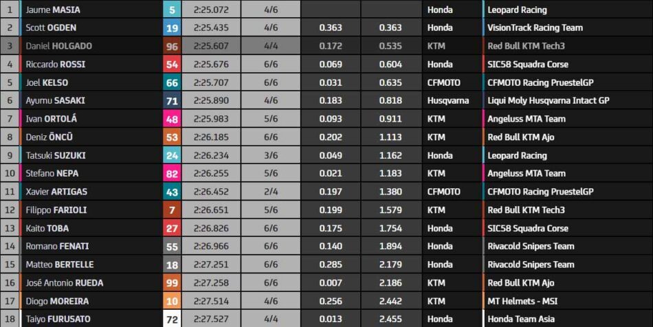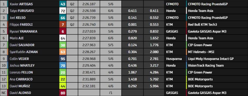 Finalement, Xavi Artigas reprend son bien quelques minutes avant la fin. L’Espagnol a l’air assez confiant sur cette piste de Silverstone. Son coéquipier Joel Kelso est également qualifié pour la Q2, tout comme Taiyo Furusato (Honda Team Asia) et le rookie Filippo Farioli (Red Bull KTM Tech3). Les grands perdants sont assurément Ryusei Yamanaka, qui subit une annulation de temps, et David Muñoz qui s’élancera de l’avant dernière position. À noter, dans les tous derniers instants, la chute de David Salvador (KTM CIP Green Power).