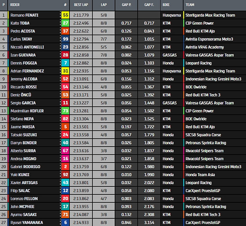 Dès son premier tour chrono, Romano Fenati (Husqvarna, Sterilgarda Max Racing Team, #55) établit un 2’12.795, et relègue l’actuel second, Dennis Foggia (Honda, Leopard Racing, #7), à 0.658s derrière lui. Le poleman, le seul à rouler en dessous des 2’13, améliore encore avec un 2’12.309 dès le tour suivant, en roulant à nouveau seul.