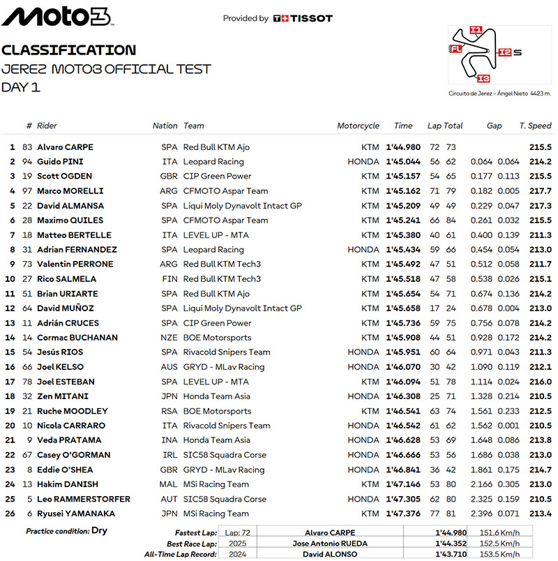 Moto3, Test Jerez J1 : Le soleil bénéficie à l’Espagnol Alvaro Carpe (Red Bull KTM Ajo)