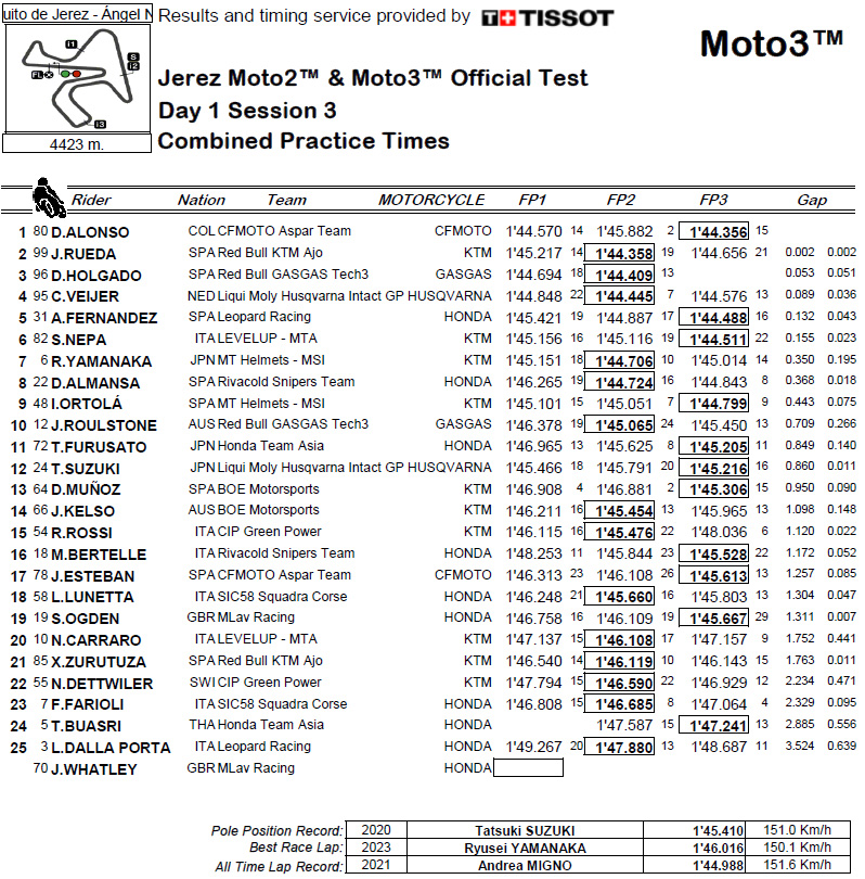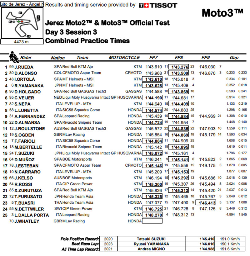 Résultats du test Moto3 à Jerez, J3 :