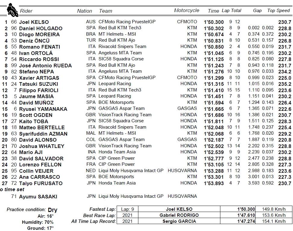 La première journée sur l’Autodromo do Algarve a débuté en douceur sur une piste encore humide après la pluie de la nuit, Joel Kelso (CFMoto Racing PrüstelGP) y réalisant le meilleur temps de la première séance devant Daniel Holgado (Red Bull KTM Tech3).