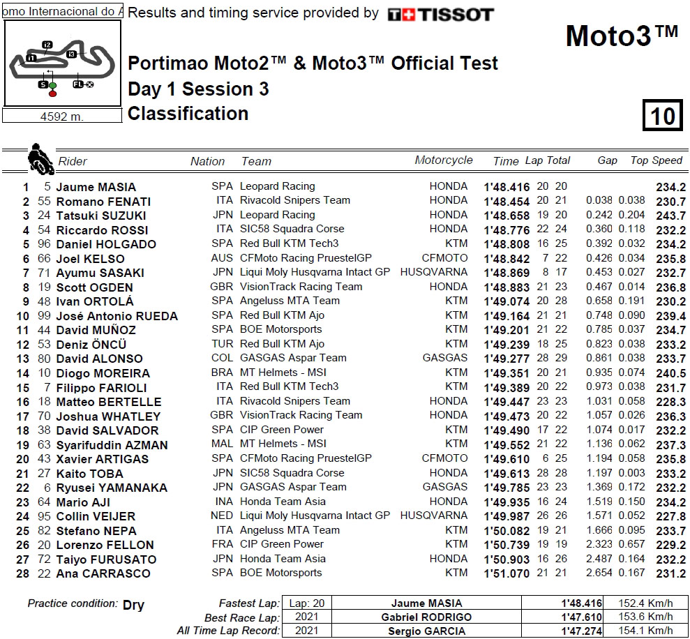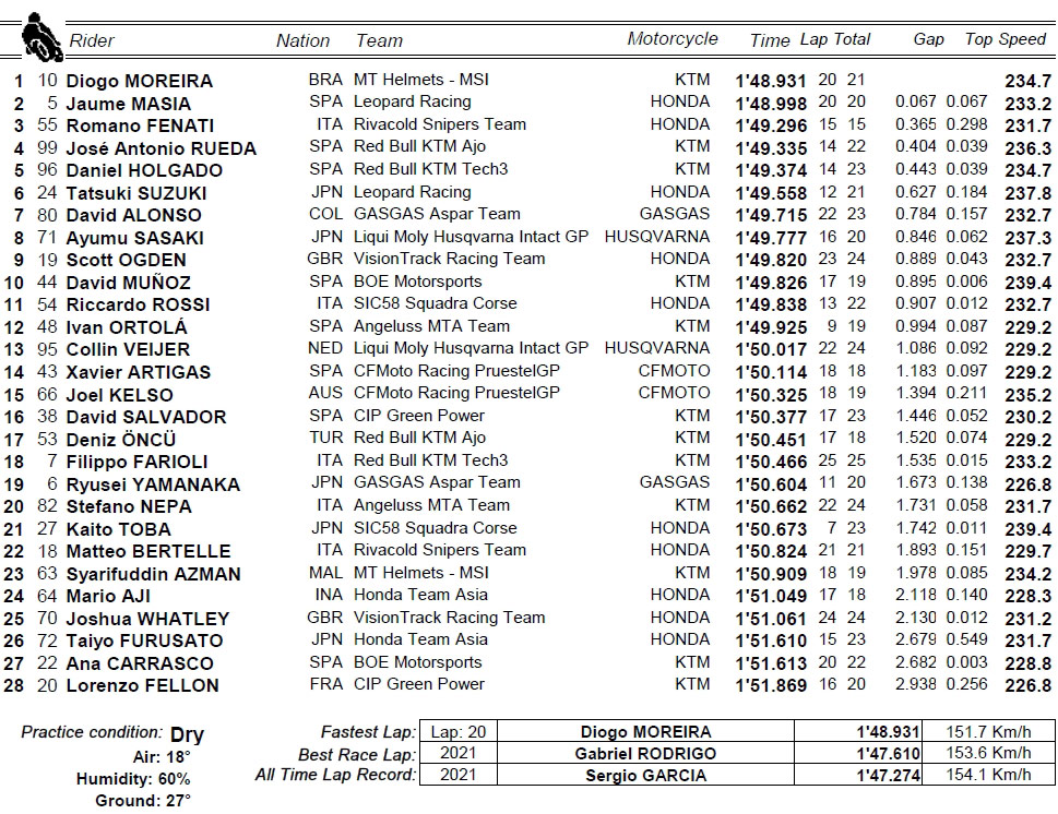 Diogo Moreira (MT Helmets – MSI) bénéficiait d’une piste plus rapide en FP2 pour s’imposer devant un Jaume Masiá (Leopard Racing) qui prenait sa revanche en FP3, arrachant finalement dans sa toute dernière tentative et par seulement 38 millièmes le meilleur temps de la journée à un Romano Fenati (Rivacold Snipers Team) heureux d’être de retour dans la catégorie légère.