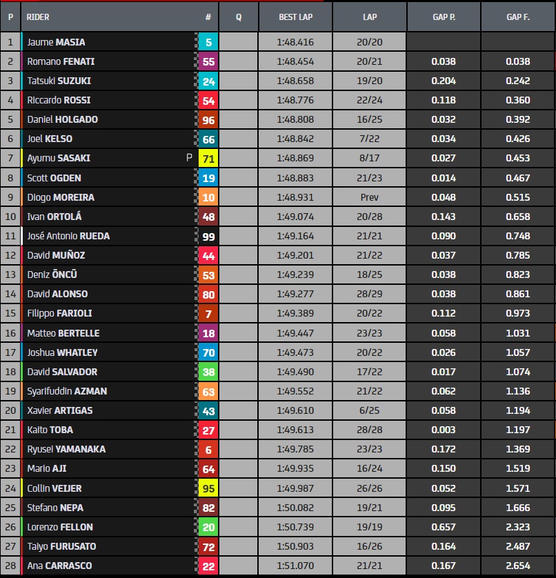 A noter une panne de batterie pour Lorenzo Fellon (CIP Green Power) et une chute pour Tatsuki Suzuki (Leopard Racing).