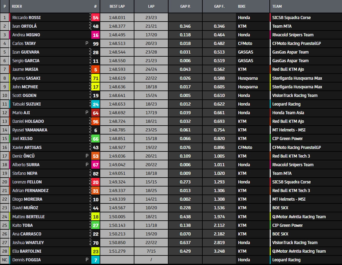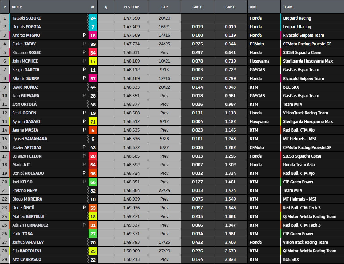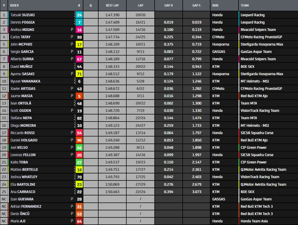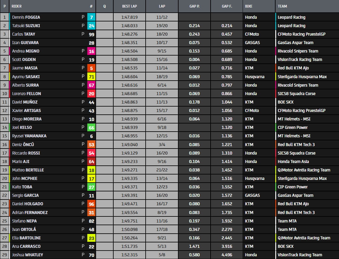 Voici Dennis Foggia en action pour la première fois ces jours-ci, même s’il n’est pas exactement en grande forme après les problèmes physiques, entre la blessure à un pied et la gastro-entérite qui l’a atteint. Mais lui et son coéquipier Tatsuki Suzuki se sont immédiatement montrés dans les premières places du classement. Des positions qui tiendront jusqu’au bout, avec l’Italien en tête et le seul à passer sous le mur de 1’48, devant la troisième place finale de Carlos Tatay. Il y a également eu une importante chute au virage #5 pour Deniz Öncü, qui a ensuite été transféré au centre médical pour des contrôles. Son compagnon de marque, Jaume Masiá, est également au sol, dans son cas au virage #3.