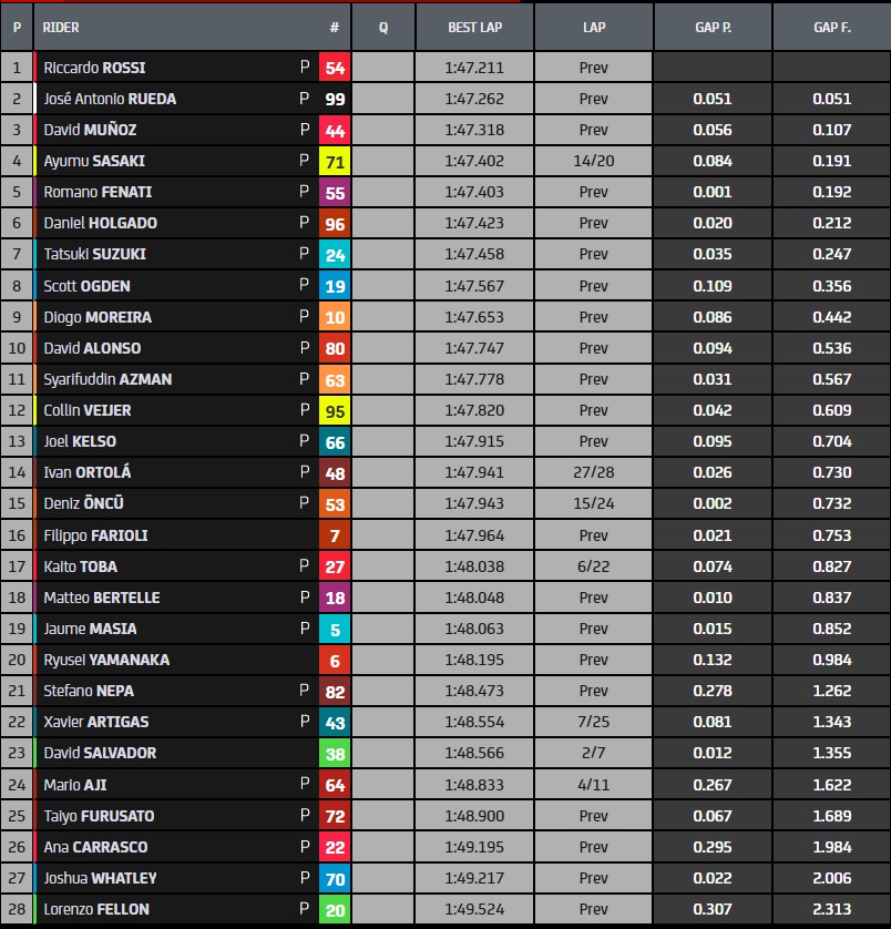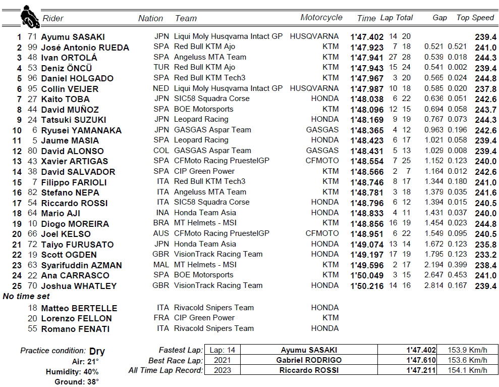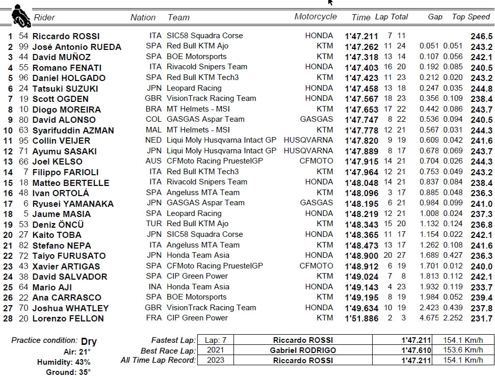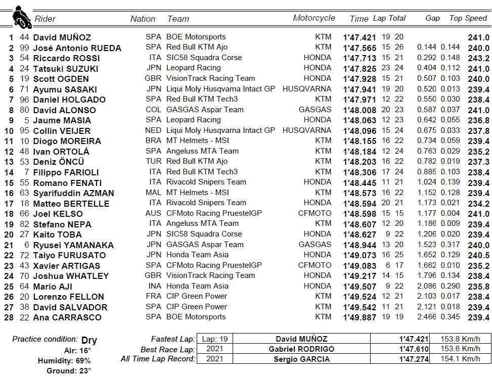 Et pourtant, dès la première session du dimanche, sur une piste pour une fois complètement sèche dès les premières minutes, David Muñoz (BOE Motorsports) faisait faire un bond en avant au meilleur chrono du test, inscrivant 1’47.421 devant José Antonio Rueda (Red Bull KTM Ajo) et Ricardo Rossi (SIC58 Squadra Corse).
