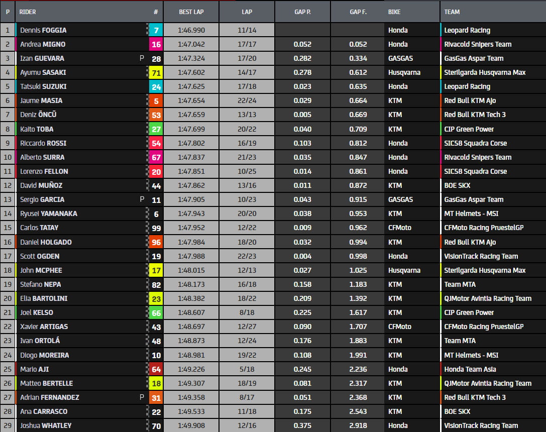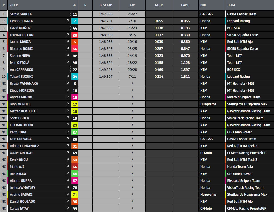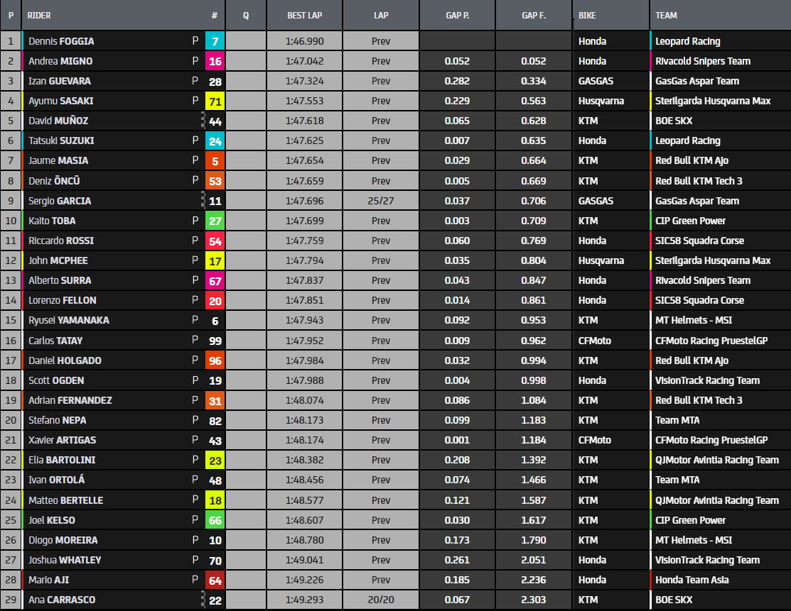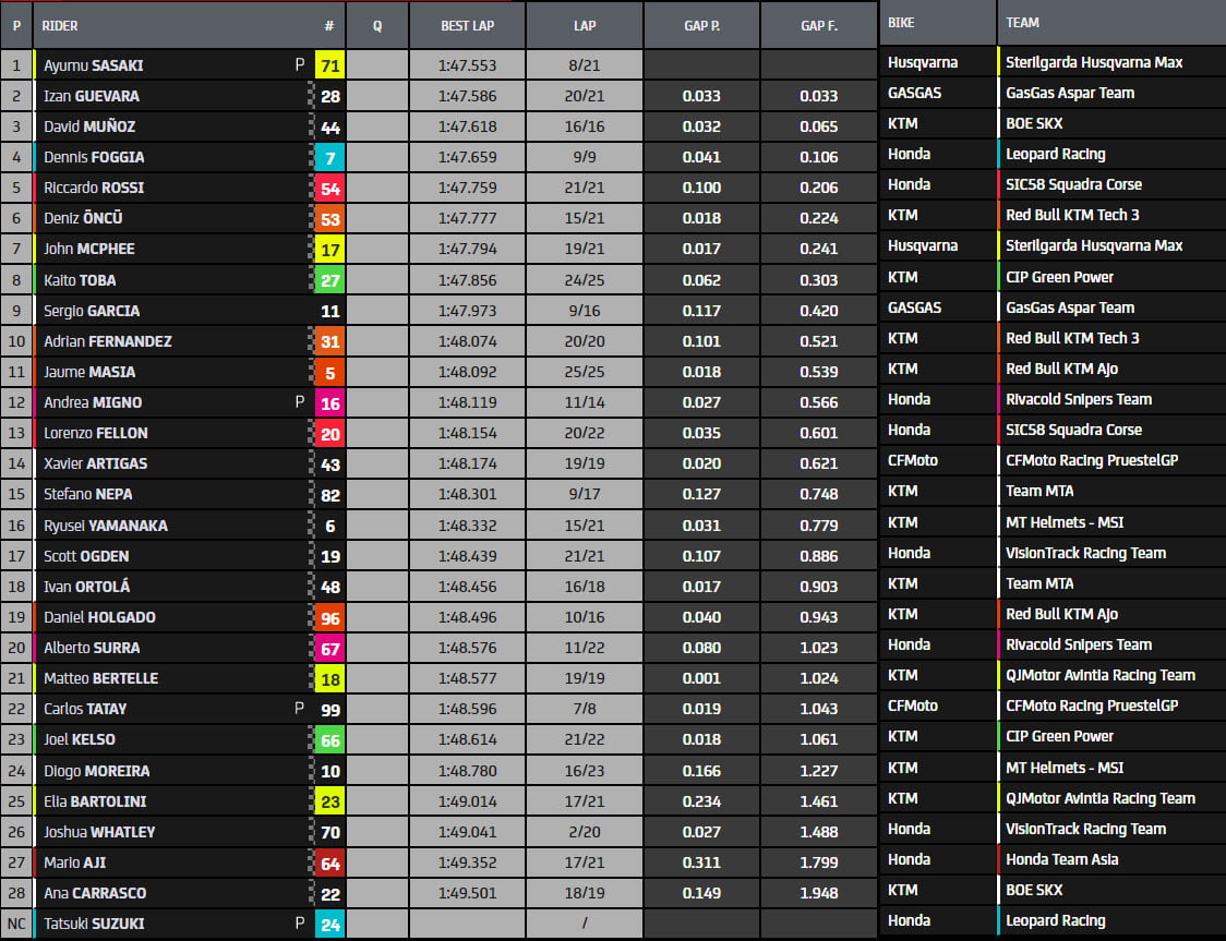 Des temps un peu plus élevés que les temps records établis lors de la session précédente. Ayumu Sasaki, la nouvelle recrue de l’équipe Max Racing, intègre le club passé sous la barre des 1’47. Un temps de 1’47.553 lui a été suffisant pour prendre la tête d’un classement très serré : Izan Guevara était à 33 millièmes, le rookie David Muñoz était à 65 millièmes et il y avait au total 19 pilotes à moins d’une seconde les uns des autres. Il y a eu une chute pour le rookie Scott Ogden, qui est tombé au virage #5.