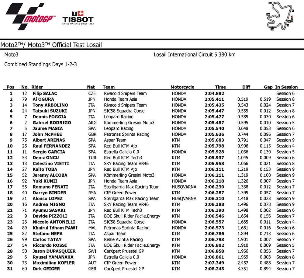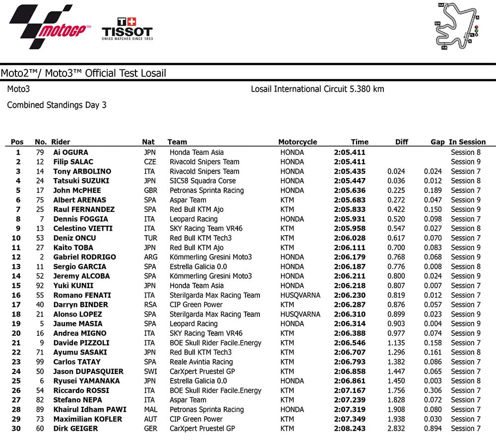 La troisième et dernière journée de tests au Qatar s’est conclue avec deux outsiders devant tout le peloton de la catégorie : le Japonais Ai Ogura (Honda, Honda Team Asia) et le Tchèque Filip Salac (Honda, Rivacold Snipers Team). Les deux hommes ont même réussi à signer exactement le même chrono, en 2’05″411.