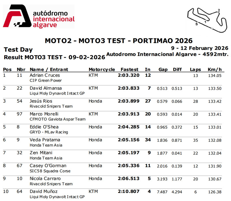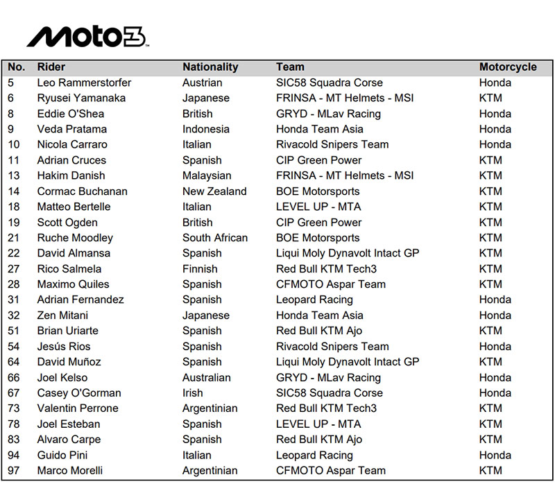 On en dénombrait en effet 10 en fin de journée, dont certains avec une présence très éphémère : Adrián Cruces (CIP – Green Power), David Almansa (Liqui Moly Dynavolt Intact GP), Jesús Rios (Rivacold Snipers Team), Marco Morelli (CFMOTO Gaviota Aspar Team), Eddie O’Shea (GRYD- MLav Racing), Veda Pratama (Honda Team Asia), Zen Mitani (Honda Team Asia), Casey O’Gorman (SIC58 Suadra Team), Nicola Carraro (Rivacold Snipers Team) et David Muñoz (Liqui Moly Dynavolt Intact GP).