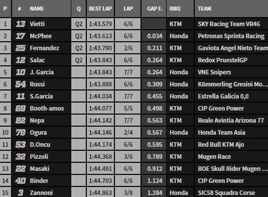 | Q2 | 13 | Celestino VIETTI | KTM | 1’43.579 | ||