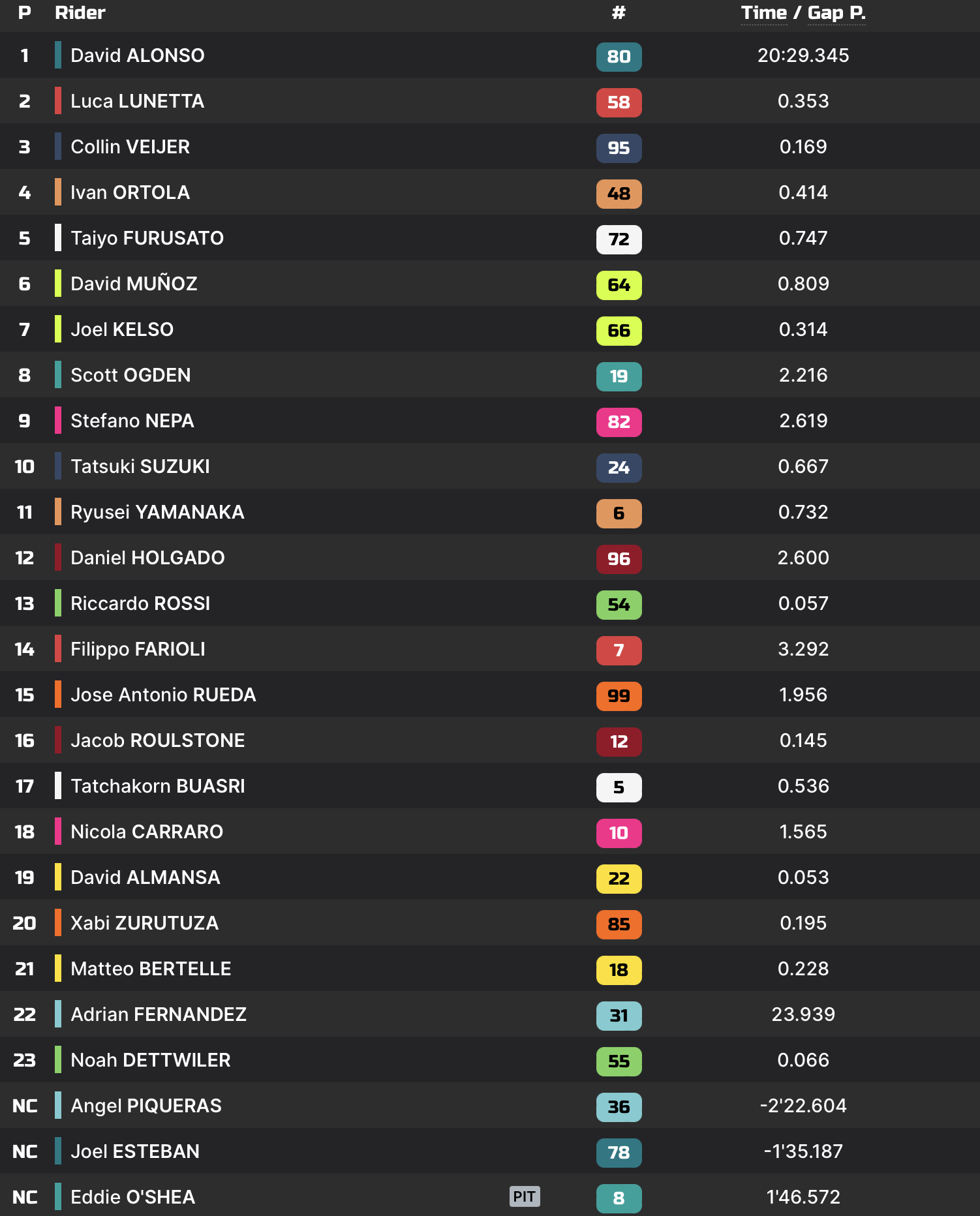 C’est pourtant Ivan Ortola qui aborde le dernier tour en tête, après avoir repris l’avantage sur le n°80. Le Colombien répond avec l’autorité dont il sait faire preuve en piste, et défend sa position jusque dans le dernier virage. C’est alors que dans un dernier espoir, Ortola tente de faire les freins au leader. Celui-ci retarde cependant son freinage au maximum, et part légèrement en glisse de l’arrière. Il fut malgré tout plus prudent que son rival qui filait tout droit, laissant passer Furusato et Veijer.
